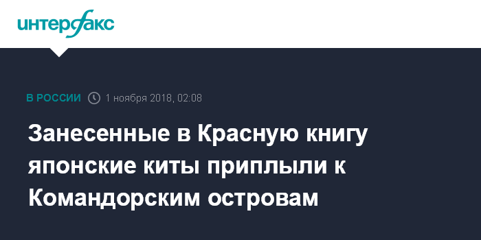 Москва. 1 ноября. INTERFAX.RU - В охраняемой акватории заповедника "Командорский" зарегистрирован японский кит, за последнюю неделю ученые встретили там три разных особи самого редкого представителя крупных китообразных, сообщает в четверг пресс-служба заповедника.