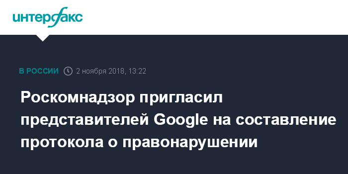 Москва. 2 ноября. INTERFAX.RU - Роскомнадзор приглашает представителей Google на составление протокола о правонарушении, которое предварительно назначено на 26 ноября, сообщил пресс-секретарь Вадим Ампелонский.