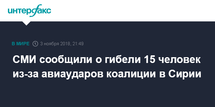 Москва. 3 ноября. INTERFAX.RU - 15 мирных жителей Сирии погибли в результате авиаудара по провинции Дейр-эз-Зор со стороны коалиции США, сообщает в субботу агентство SANA.