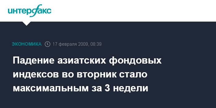 Москва. 17 февраля. INTERFAX.RU - Азиатские фондовые индексы снижаются во вторник, и падение достигло максимума за 3 недели в связи с опасениями, что стоимость кредитования вырастет на фоне углубления рецессии и затруднит ведение деятельности компаний, сообщает агентство Bloomberg.