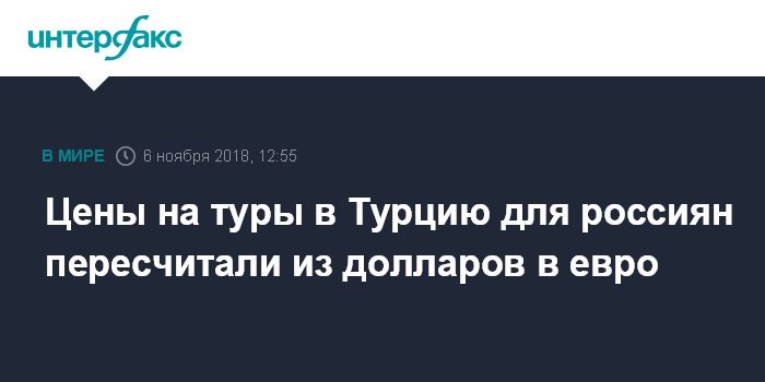 Москва. 6 ноября. INTERFAX.RU - Несколько крупных российских туроператоров сменили расчетную валюту для туров в Турцию с доллара на евро, сообщили "Интерфаксу" в Ассоциации туроператоров России (АТОР).