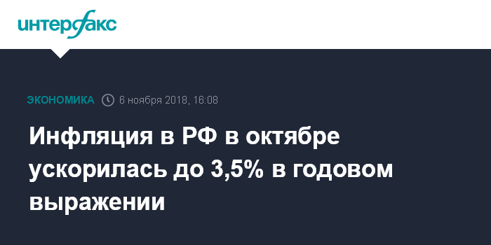 Москва. 6 ноября. INTERFAX.RU - Инфляция в РФ в октябре 2018 года ускорилась до 0,4%, в годовом выражении - до 3,5% (с 3,4% в сентябре), сообщил во вторник Росстат.