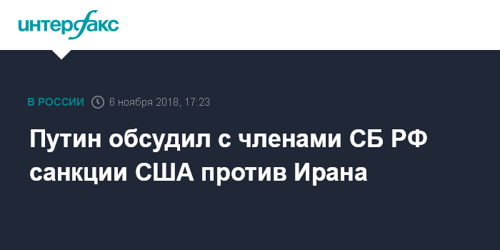 Москва. 6 ноября. INTERFAX.RU - Президент РФ Владимир Путин обсудил с постоянными членами Совета безопасности России ситуацию после введения Соединенными Штатами санкций в отношении Ирана, а также вопросы подготовки к саммиту ОДКБ, сообщил пресс-секретарь президента РФ Дмитрий Песков.