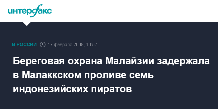 Москва. 17 февраля. INTERFAX.RU - Береговая охрана Малайзии задержала семерых индонезийских пиратов в Малаккском проливе, сообщили во вторник местные СМИ.