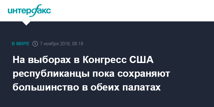 Москва. 7 ноября. INTERFAX.RU - По предварительным результатам, основанным на подсчете голосов на закрывшихся избирательных участках на проходящих в США выборах в Конгресс, представителям Республиканской партии пока удается сохранять большинство в палате представителей и сенате.