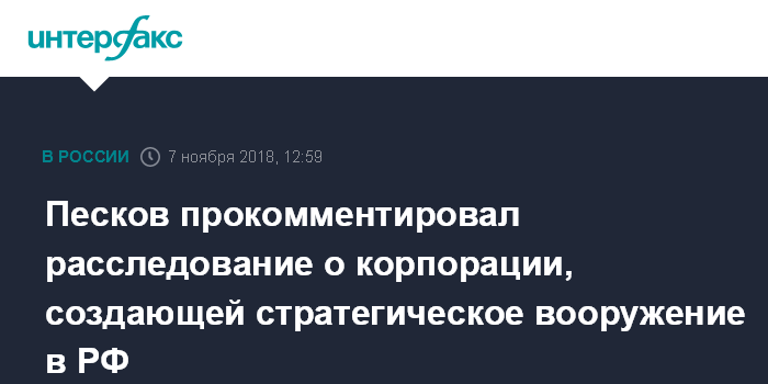 Москва. 7 ноября. INTERFAX.RU - В Кремле видели расследование "Новой газеты" относительно корпорации, создающей стратегическое вооружение в России, но не уверены в достоверности изложенных в статье фактов, заявил пресс-секретарь президента РФ Дмитрий Песков.