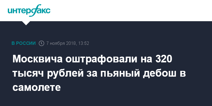Москвича оштрафовали на 320 тысяч рублей за пьяный дебош в самолете