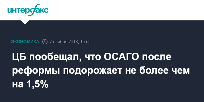 Москва. 7 ноября. INTERFAX.RU - Средняя цена полиса ОСАГО после проведения реформы по либерализации тарифов в этом сегменте, если страховщики будут повышать тарифы, может вырасти не более чем на 1,5%, заявил зампред Банка России Владимир Чистюхин на совместном заседании комитетов Госдумы по транспорту и по финансовому рынку.