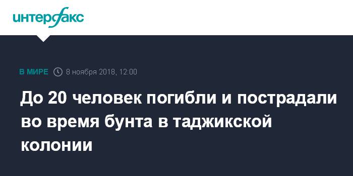 Москва. 8 ноября. INTERFAX.RU - Число погибших и раненых в результате беспорядков в колонии строгого режима в Худжанде на севере Таджикистана может достигать от 10 до 20 человек, сообщают в четверг местные СМИ.