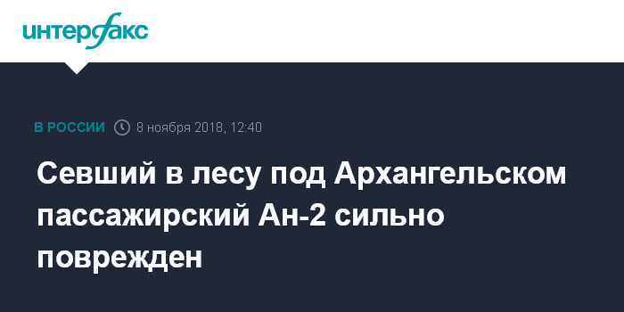 Ранее источник в экстренных службах сообщил "Интерфаксу", что обледеневший в воздухе пассажирский самолет Ан-2 жестко приземлился в лесном массиве в Архангельской области. По его словам, на борту 11 пассажиров, включая ребенка, с ними есть связь. По предварительной информации сообщалось, что люди получили травмы, но никто не погиб. Среди пассажиров есть медик, он оказывает помощь пострадавшим.