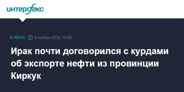 Москва. 9 ноября. INTERFAX.RU - Власти Ирака близки к соглашению с Региональным правительством Курдистана о возобновлении экспорта нефти из полуавтономной провинции Киркук, пишет Financial Times со ссылкой на информированные источники.