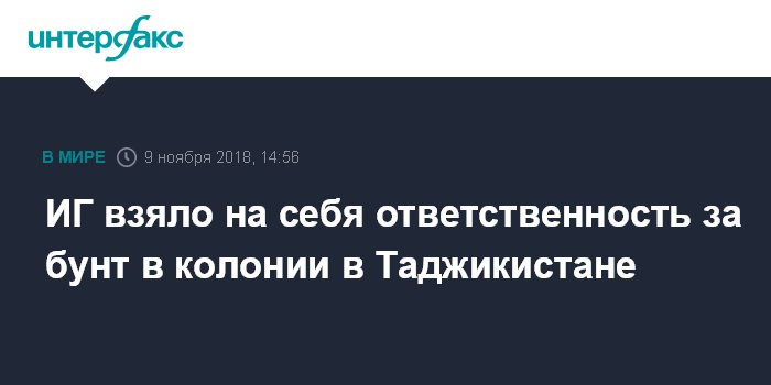 Москва. 9 ноября. INTERFAX.RU - Ответственность за организацию беспорядков в колонии строгого режима в Худжанде на севере Таджикистана взяла на себя террористическая организация "Исламское государство" (ИГ - запрещена в России), сообщает таджикская служба "Радио Свобода" со сслыкой на близкое к боевикам информагентство Amaq.