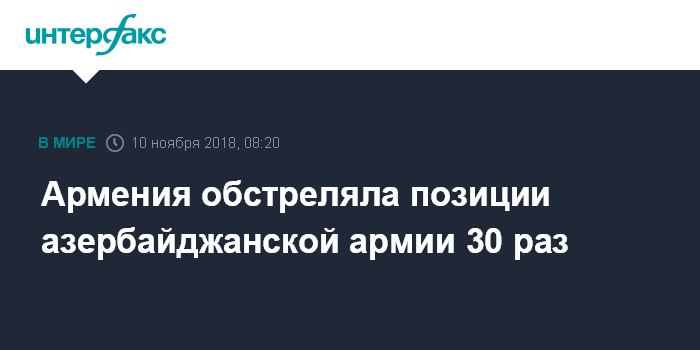 Москва. 10 ноября. INTERFAX.RU - Вооруженные силы Армении нарушили за минувшие сутки режим прекращения огня на линии соприкосновения азербайджанских и армянских вооруженных сил 30 раз, сообщает пресс-служба Министерства обороны Азербайджана.