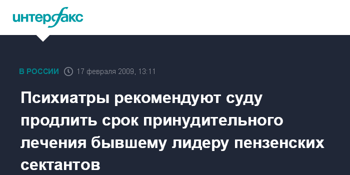 Москва. 17 февраля. INTERFAX.RU - Врачебная комиссия Пензенской областной психиатрической больницы провела обследование состояния здоровья бывшего лидера местных сектантов Петра Кузнецова, находящегося по решению суда на принудительном лечении с августа 2008 года.