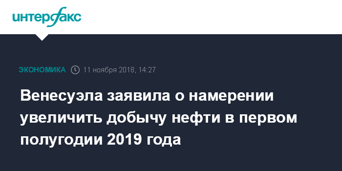 Москва. 11 ноября. INTERFAX.RU - Венесуэла хочет увеличить добычу нефти на 1 млн б/с в первом полугодии 2019 году с текущего уровня в 1,5 млн б/с, сообщил журналистам министр нефти страны министр нефти страны Мануэль Кеведо.