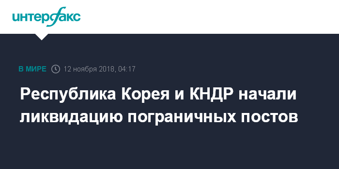 Москва. 12 ноября. INTERFAX.RU - Южная и Северная Кореи приступили к ликвидации 20 пограничных постов, сообщило информационное агентство "Ренхап".