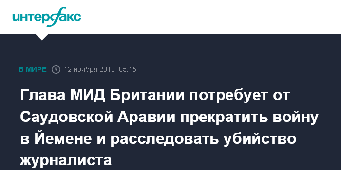 Глава МИД Британии потребует от Саудовской Аравии прекратить войну в Йемене и расследовать убийство журналиста