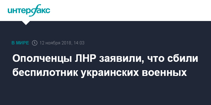 Москва. 12 ноября. INTERFAX.RU - Силы противовоздушной обороны Народной милиции самопровозглашенной Луганской народной республики заявили об уничтожении у линии соприкосновения в Донбассе беспилотного летательного аппарата Вооруженных сил Украины.