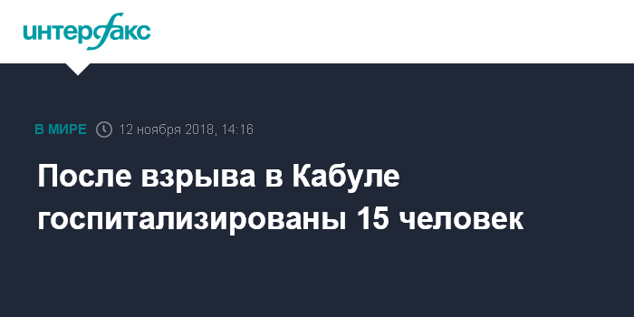 Москва. 12 ноября. INTERFAX.RU - Не менее 15 человек госпитализированы после взрыва на площади Малика Асгара в Кабуле, один из них скончался от полученных ран, говорится в сообщении, опубликованном в твиттере городской клиники скорой помощи.