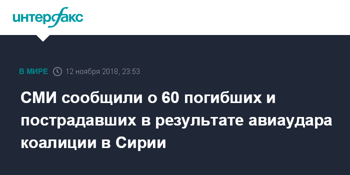 Москва. 12 ноября. INTERFAX.RU - Более 60 мирных жителей Сирии погибли и пострадали в результате авиаудара по провинции Дейр-эз-Зор со стороны коалиции США, сообщает в понедельник агентство SANA.