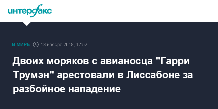 Москва. 13 ноября. INTERFAX.RU - Португальская полиция арестовала за разбойное нападение двух американских военнослужащих с атомного авианосца ВМС США "Гарри Трумэн", который находится с визитом в столице страны Лиссабоне, сообщает Publico.