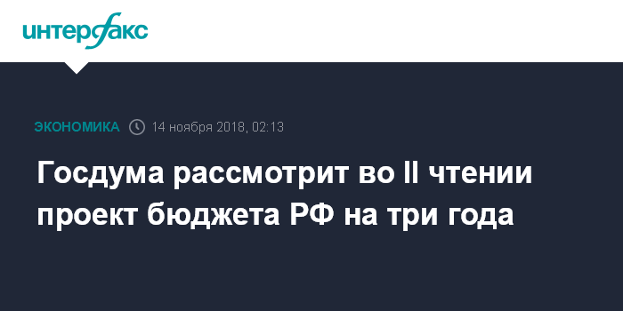 Москва. 14 ноября. INTERFAX.RU - Госдума на заседании в среду планирует рассмотреть в основном, втором чтении проект федерального бюджета на 2019-2021 годы, а также бюджеты Пенсионного фонда РФ (ПФР), Фонда социального страхования (ФСС) и Фонда обязательного медицинского страхования (ФОМС).