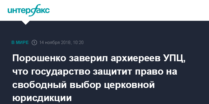 Москва. 14 ноября. INTERFAX.RU - Президент Украины Петр Порошенко на встрече в "Украинском доме" во вторник заверил группу архиереев Украинской православной церкви (Московский патриархат) в том, что государство защитит право священнослужителей и мирян на свободный выбор церковной юрисдикции, сообщил пресс-секретарь главы государства Святослав Цеголко.