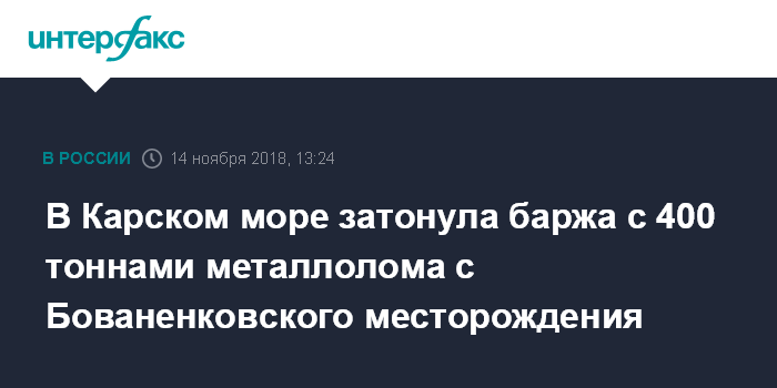 Москва. 14 ноября. INTERFAX.RU - Четыреста тонн металлолома, которые перевозил на барже буксир "Герой П. П. Кожин", затонули в Карском море во время шторма, говорится в пресс-релизе Обь-Иртышского управления Госморречнадзора.