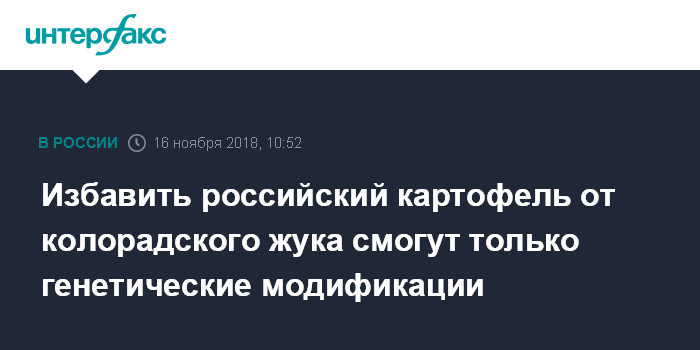 Москва. 16 ноября. INTERFAX.RU - Вывести методами традиционной селекции российский картофель, не подверженный поражению колорадским жуком, невозможно, считает замдиректора Института цитологии и генетики - руководитель филиала Сибирский НИИ растениеводства и селекции Иван Лихенко.