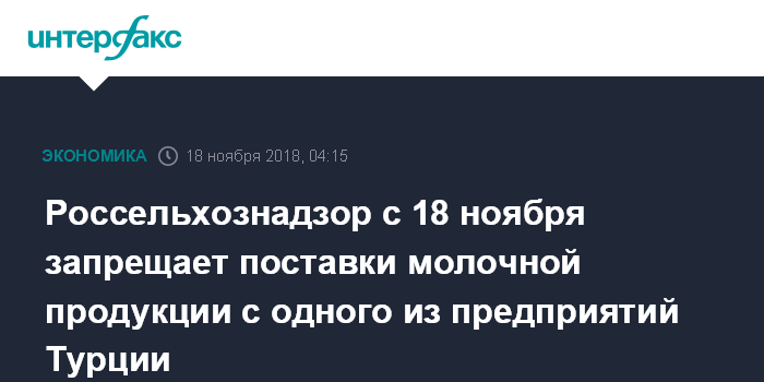 Россельхознадзор с 18 ноября запрещает поставки молочной продукции с одного из предприятий Турции