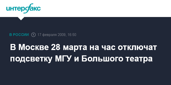 "По планам устроителей акции, 28 марта 2009 г. в 20:30 мск на час будет отключена подсветка ряда знаковых московских объектов, таких, как МГУ, мэрия, Большой театр, Манеж, а также московских мостов", - рассказал собеседник агентства. По его данным, к акции в 2009 г. уже присоединились более 300 городов мира, а также такие российские города, как Петропавловск-Камчатский и Мурманск.