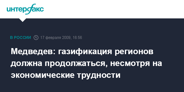 Москва. 17 февраля. INTERFAX.RU - Программа газификации российских регионов, несмотря на финансово-экономические сложности в стране, должна оставаться в числе приоритетов и центральных, и местных властей, заявил президент РФ Дмитрий Медведев.
