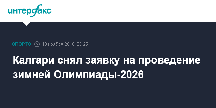 Москва. 19 ноября. INTERFAX.RU - Канадский город Калгари в понедельник официально снял заявку на проведение Олимпиады-2026 с рассмотрения в Международном олимпийском комитете, заявил журналистам мэр города Нахид Ненши.