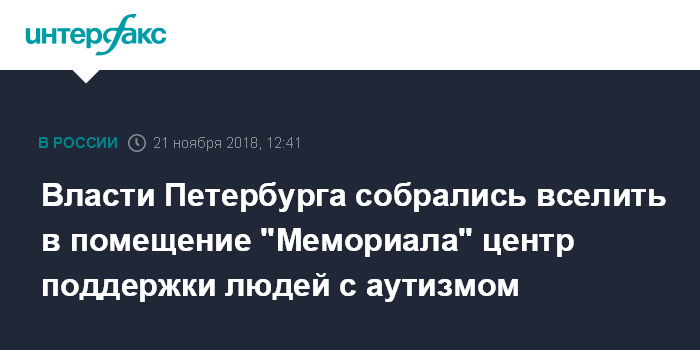 Москва. 21 ноября. INTERFAX.RU - Власти Санкт-Петербурга рассматривают возможность предоставления Центру поддержки людей с аутизмом "Антон тут рядом" помещения, в течение многих лет занимаемого правозащитной организацией "Мемориал", с которой город не стал продлевать договор аренды.