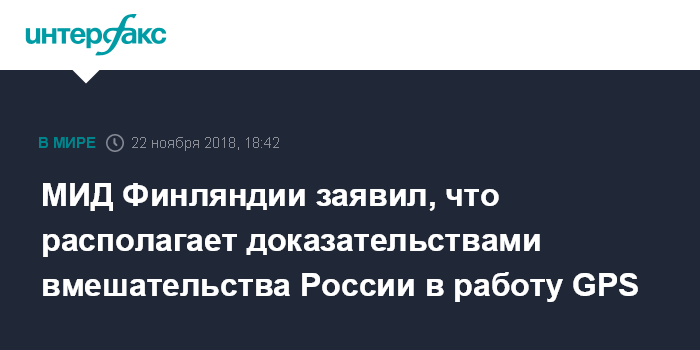 Москва. 22 ноября. INTERFAX.RU - Министр иностранных дел Финляндии Тимо Сойни заявил, что у его страны есть доказательства вмешательства России в работу глобальной навигационной системы GPS во время учений НАТО Trident Juncture.