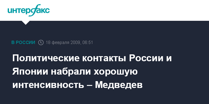 Южно-Сахалинск. 18 февраля. ИНТЕРФАКС - Президент России Дмитрий Медведев в среду в Южно-Сахалинске на переговорах премьер-министром Японии Таро Асо в расширенном составе отметил, что политические контакты РФ и Японии набрали интенсивный темп.
