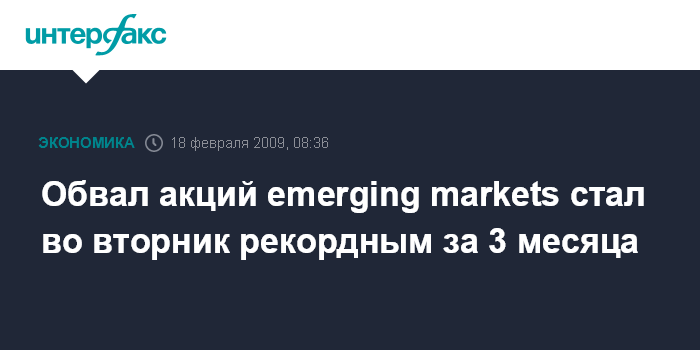 Москва. 18 февраля. INTERFAX.RU - Обвал акций emerging markets стал во вторник рекордным за 3 месяца на фоне снижения цен на сырье и страхов, связанных с последствиями мирового кризиса для стран Восточной Европы.