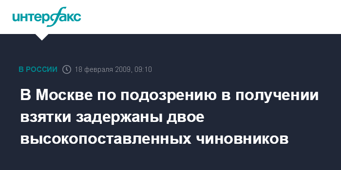 Москва. 18 февраля. INTERFAX.RU - В Москве по подозрению в получении 1 млн рублей в качестве взятки задержаны двое высокопоставленных чиновников, сообщил "Интерфаксу" источник в правоохранительных органах города.