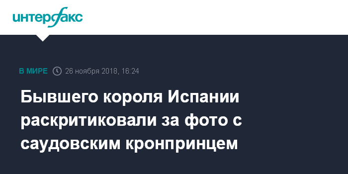 Москва. 26 ноября. INTERFAX.RU - Бывший король Испании Хуан Карлос I подвергся критике после публикации фотографии, на которой он запечатлен с принцем Саудовской Аравии Мухаммедом бин Салманом, сообщает в понедельник El Pais.