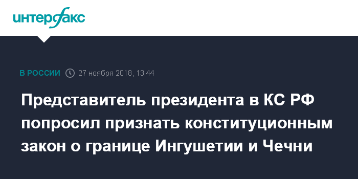 Москва. 27 ноября. INTERFAX.RU - Представитель президента в КС РФ Михаил Кротов просит суд признать конституционным закон и соглашение, определяющие границы Ингушетии и Чечни.