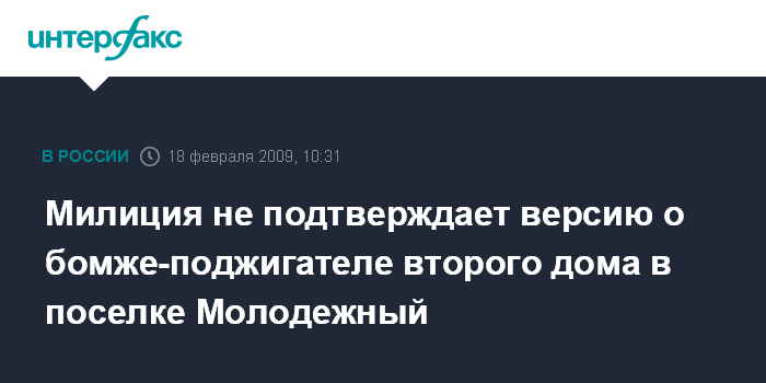 Москва. 18 февраля. INTERFAX.RU - Информация о бомже, совершившем 17 февраля поджог в поселке Молодежный Астраханской области, не подтверждается, сообщили агентству "Интерфакс-Юг" в пресс-службе УВД области в среду.
