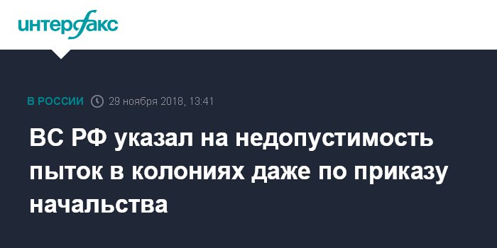 Москва. 29 ноября. INTERFAX.RU - Верховный суд России указал на недопустимость применеия насилия к заключенным даже в том случае, если это делается по приказу вышестоящих органов или должностных лиц.