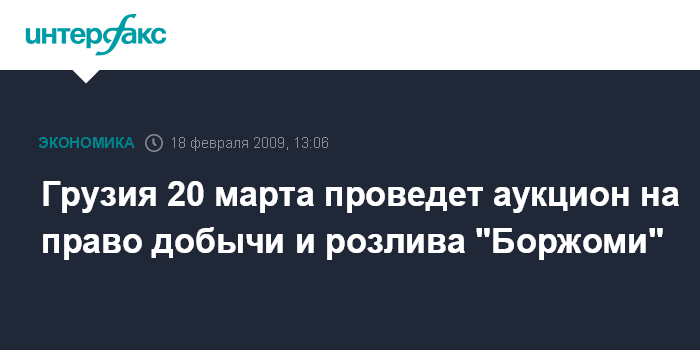 Москва. 18 февраля. INTERFAX.RU - Министерство экономического развития Грузии в среду объявило открытый аукцион на получение 25-летней генеральной лицензии на право добычи и розлива минеральной воды "Боржоми".