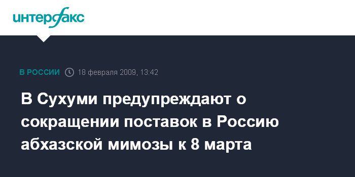 Москва. 18 февраля. INTERFAX.RU - В этом году количество мимозы, поставляемой из Абхазии в Россию к празднику 8 марта, составит всего около 25% от экспортных объемов весны-2008, сообщил "Интерфаксу" в среду директор Института ботаники Академии наук Абхазии Сергей Бебия.