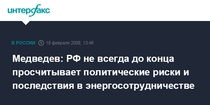 Москва. 18 февраля. INTERFAX.RU - Отношения России с международным сообществом в рамках энергетического сотрудничества недостаточно систематизированы, зачастую не просчитываются политические риски, заявил президент РФ Дмитрий Медведев.