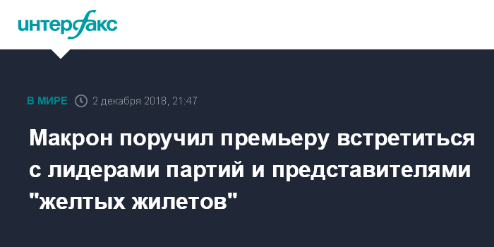 Президент Франции Эммануэль Макрон поручил премьер-министру страны Эдуару Филиппу встретиться с руководителями политических партий, представленных в парламенте, и представителями манифестантов, объявила в воскресенье президентская канцелярия после экстренного совещания в Елисейском дворце, посвященного протестной волне.