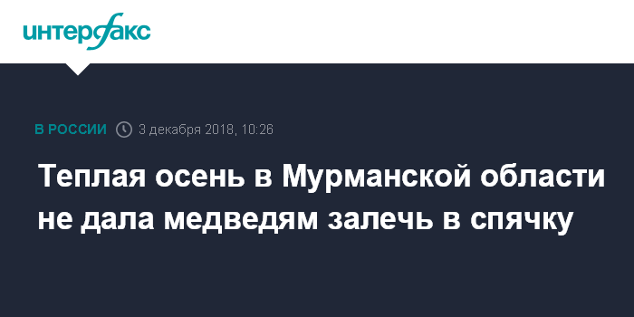 Москва. 3 декабря. INTERFAX.RU - Теплая осень в Мурманской области не позволила всем бурым медведям залечь в спячку, в результате некоторые из них продолжают нагуливать жир, сообщили "Интерфаксу" в региональном Госохотнадзоре.