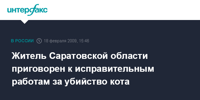 Москва. 18 февраля. INTERFAX.RU - Житель города Балаково Саратовской области осужден за убийство домашнего кота. "Мировой судья судебного участка N1 по Балаковскому району приговорил подсудимого по ч.1 ст.245 УК РФ (жестокое обращение с животными) к исправительным работам сроком на 6 месяцев с удержанием 10% заработка в доход государства", - сообщила прокуратура Саратовской области.