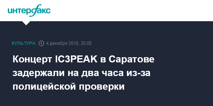 Москва. 4 декабря. INTERFAX.RU - Начало концерта музыкальной группы IC3PEAK, запланированного на 20:00 по местному времени во вторник, задержано более чем на два часа, поскольку ночной клуб проверяла полиция.