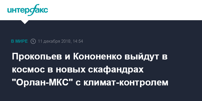 Москва. 11 декабря. INTERFAX.RU - Космонавты "Роскосмоса" Сергей Прокопьев и Олег Кононенко выйдут в открытый космос в скафандрах нового поколения "Орлан-МКС", сообщает госкорпорация "Роскосмос".